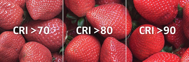 Der Farbwiedergabeindex (CRI oder Ra) ist ein Qualitätsmerkmal von künstlichem Licht. Eine Lichtquelle, deren Licht alle Spektralfarben genau so gut wiedergibt wie Sonnenlicht / Tageslicht, lässt die Farben der von ihr beleuchteten Gegenstände 100 % natürlich aussehen – der Farbwiedergabewert ist in diesem Fall CRI 100. Dieser Wert ist eine noch nicht erreichbare Größe von künstlichem Licht, wobei modernen Hochleistungs-LEDs bereits Werte von CRI 97 bis 98 aufweisen können. Fazit je höher der CRI Wert, desto besser. Wir empfehlen für Innenräume Werte ab CRI 90.